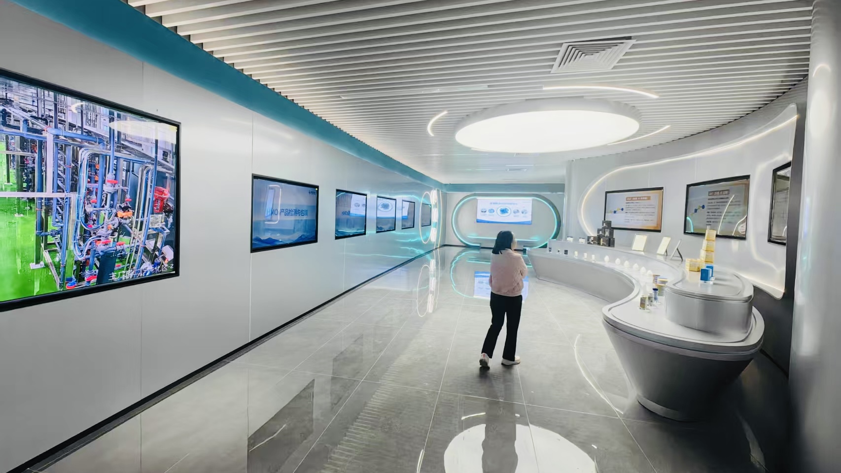 160寸小(xiǎo)間(jiān)距LED:16:9比例,作(zuò)為(wèi)展廳的(de)主視(shì)覺焦點,用(yòng)于播放(fàng)震撼的(de)全景視(sh&ì)頻(pín)內(nèi)容。