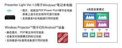 多(duō)種實用(yòng)功能(néng) - 無線模塊ET-WML100C(選配件(jiàn))輕松實現(xiàn)無線投影(yǐng) 将無線模塊ET-WML100C(選配件(jiàn))插入投影(yǐng)機(jī)端口USB A,即可(kě)無線投影(yǐng)安裝有(yǒ↔u)相(xiàng)應免費(fèi)軟件(jiàn)的(de)通(tōng)用(yòng)設備上(shàng)的(de)畫(hu à)面。