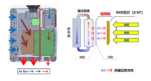 全分(fēn)離(lí)式氣流散熱(rè)系統(左)、珀耳帖液冷(lěng)散熱(rè)技(jì)術(shù)(右)